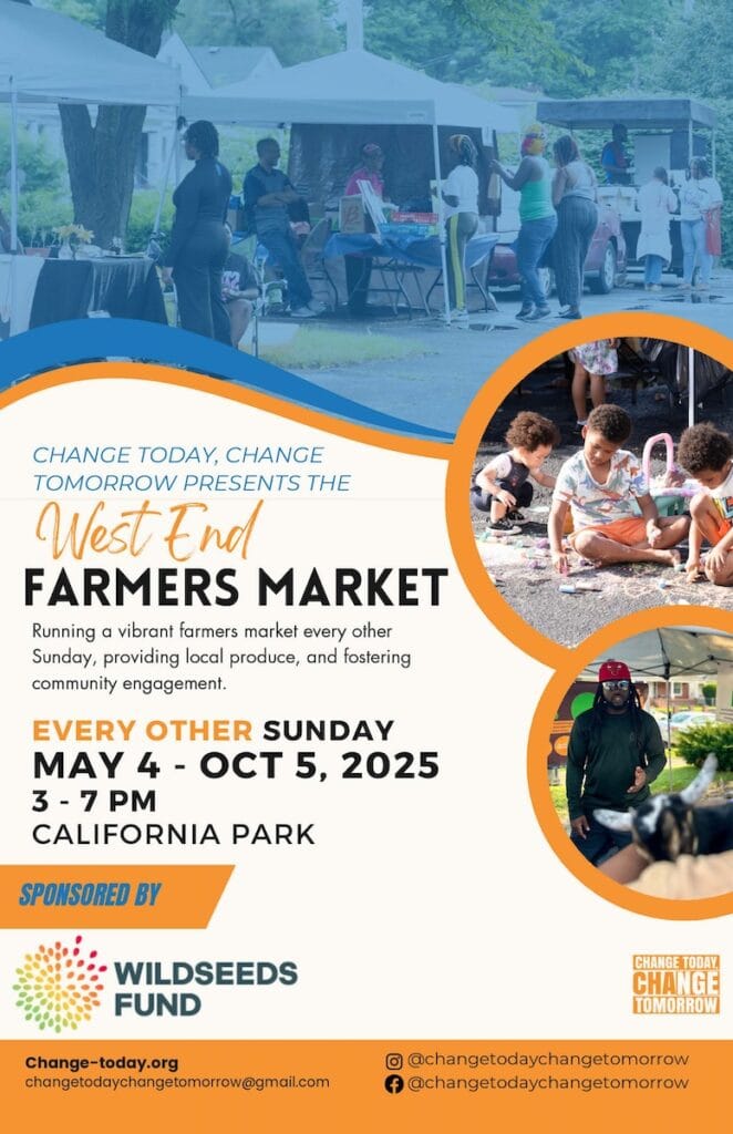 The West End Farmers Market is biweekly on Sundays from 3 – 7 p.m. in California Park. It’s held each year from early May through early October. The market was recently approved to accept SNAP benefits. The market also participates in the Kentucky Double Dollars program through the Community Farm Alliance.