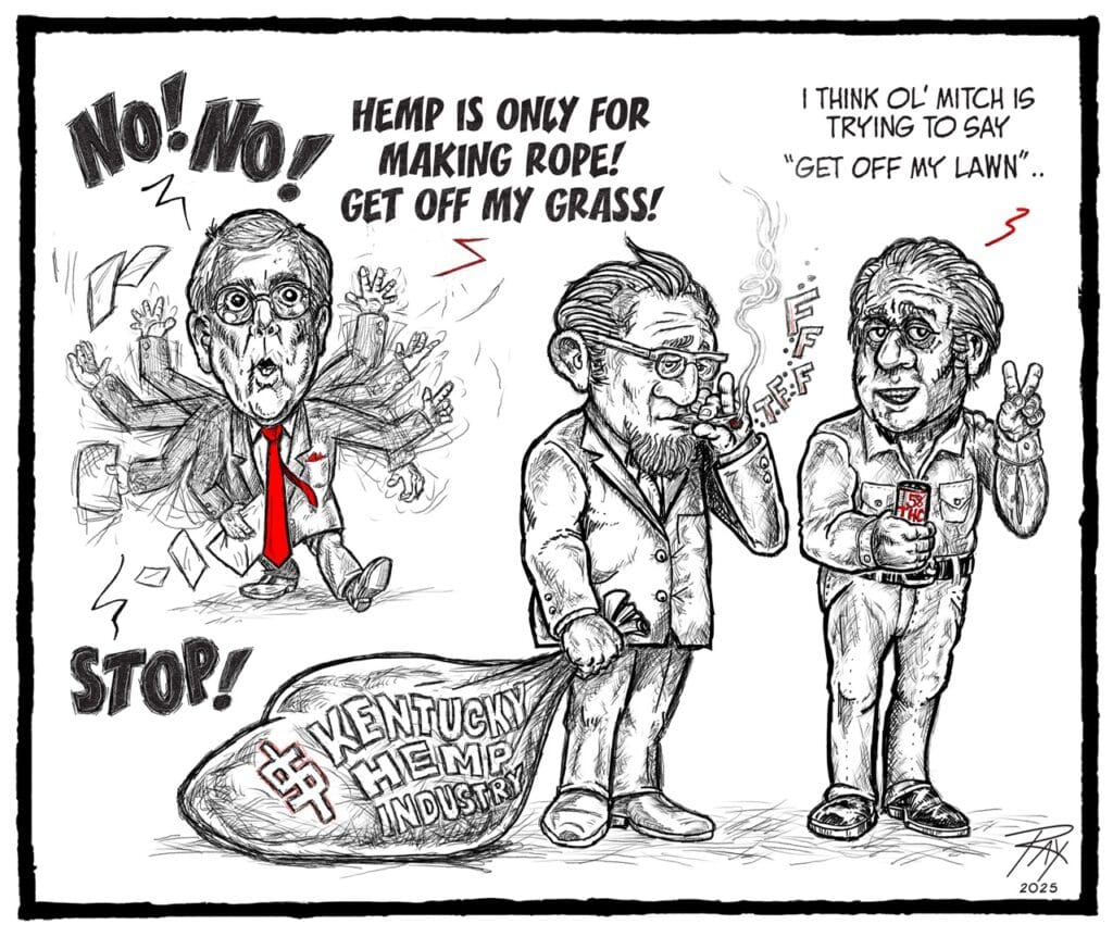 “The Reopen Government bill has a buried passage that will totally shut down the large and expanding Hemp THC derivative business everywhere –especially in Kentucky,” Ray said. This week’s cartoon is a take on Mitch McConnell’s tantrum about hemp.