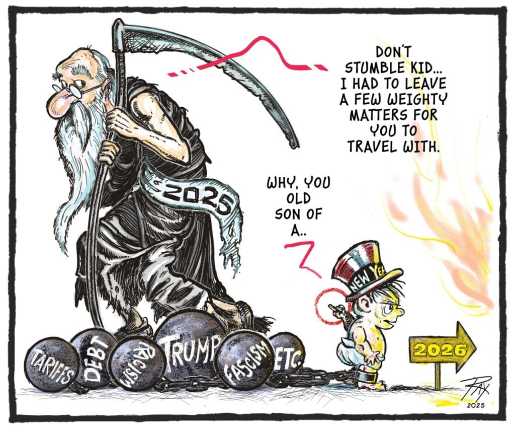 This week’s cartoon addresses 2025, and what a year it has been. “There are so many pressing problems facing freedom today that I picked only a few to spotlight. That doesn’t make justice, war, poverty, anti-semitism, or anything else that Project 2025 and the Donald has implemented less important – there just isn’t that much room in one panel!” said Ray.