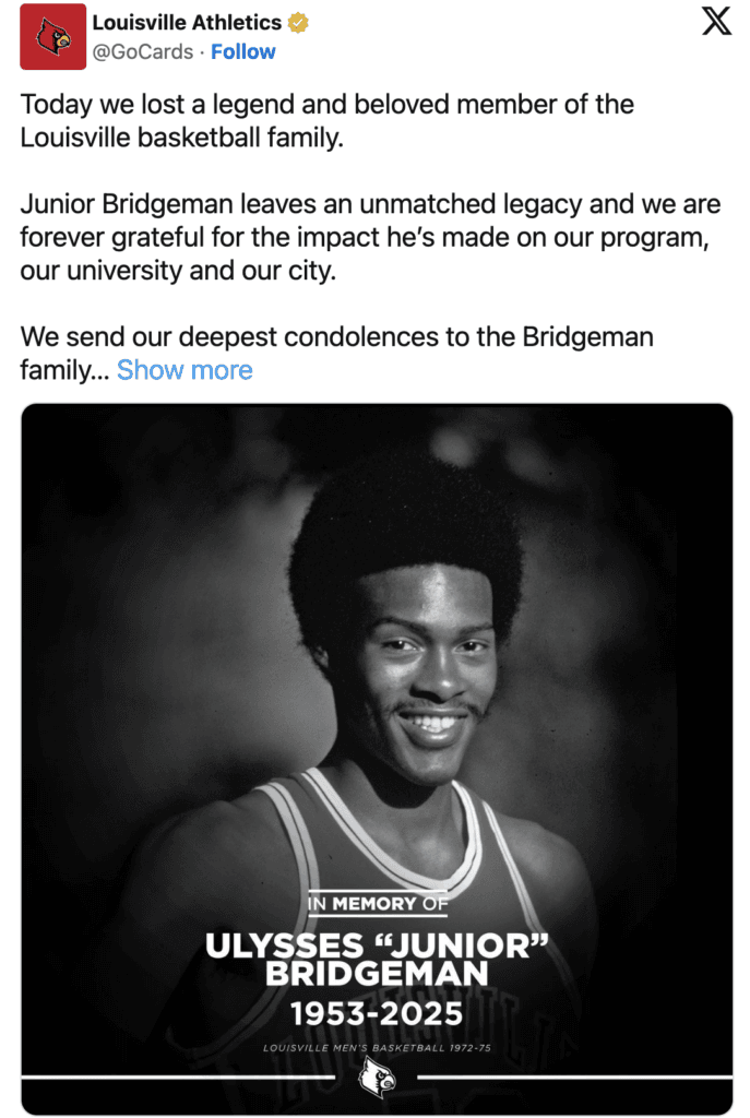 “I know we all are experiencing great sadness today following the tragic loss of one of the University of Louisville’s most accomplished alumni, Ulysses “Junior” Bridgeman,” she said in the statement. “Mr. Bridgeman (’75) attended UofL from 1972-1975 and developed into a legendary basketball player under Coach Denny Crum. He went on to play for 12 seasons in the NBA with the Milwaukee Bucks and the Los Angeles Clippers.