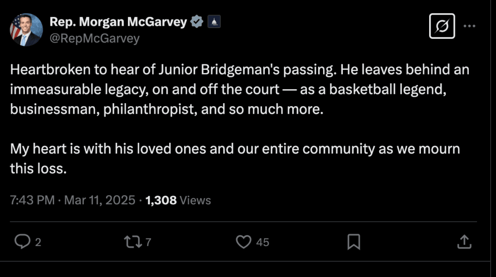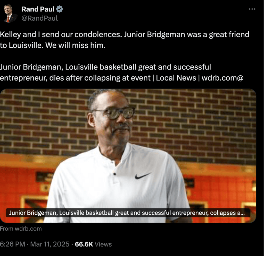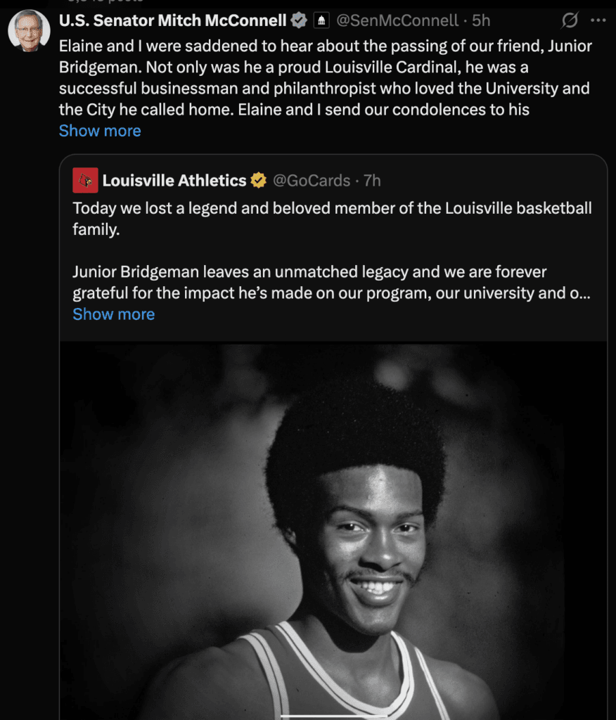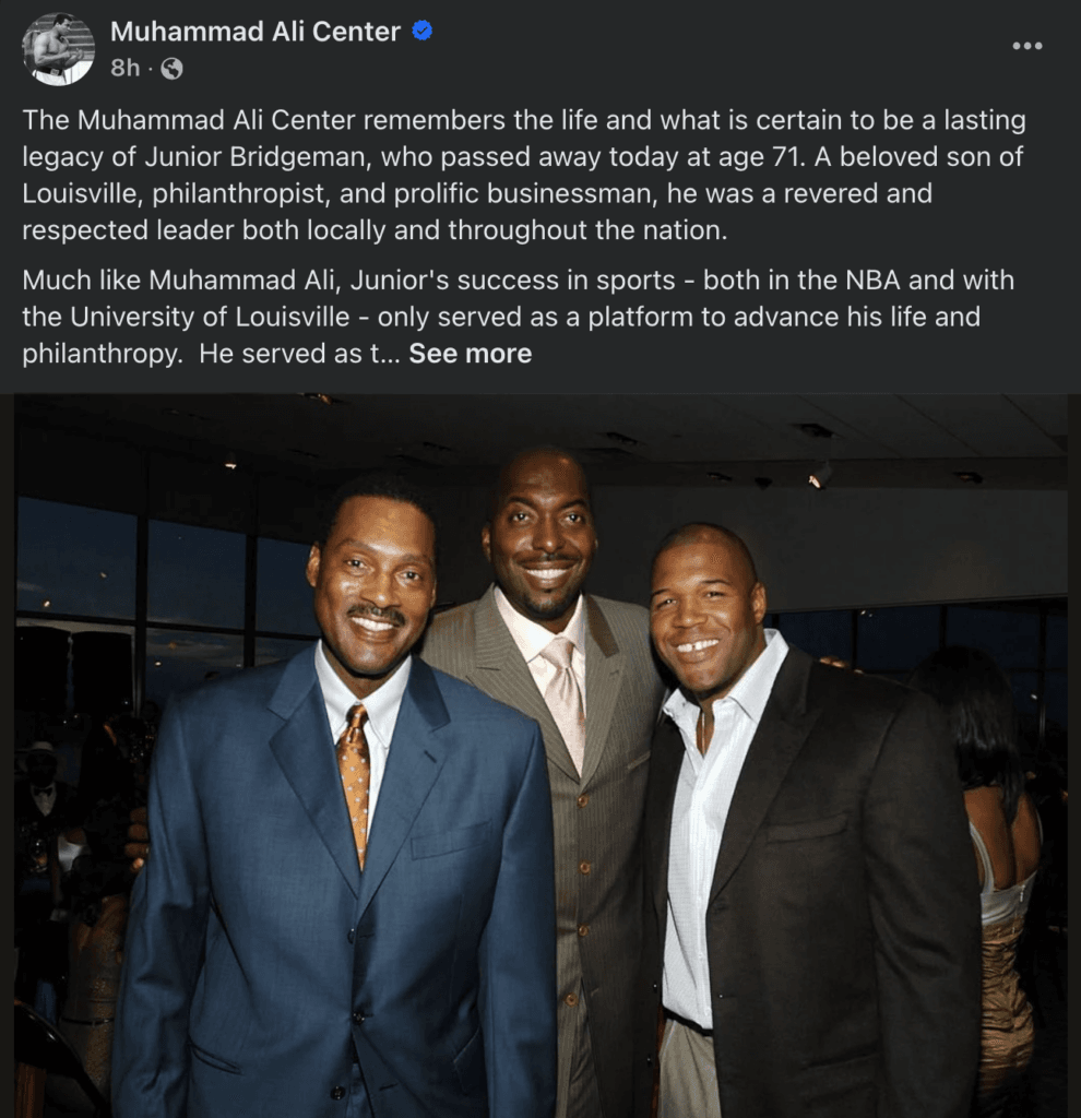 Louisville Mayor Greenberg said, “Today, we lost a kind, generous and groundbreaking legend. He was an All-American at UofL, an NBA All-Star, and a self-made billionaire. Yet, I will most remember Junior Bridgeman for his quiet, impactful assistance to others in need, his love for Doris and his entire family, and his never-ending support for our community. Junior made us all better people and Louisville a better city. Rachel & I send our love and prayers to the Bridgeman family. May Junior’s memory be a blessing.”