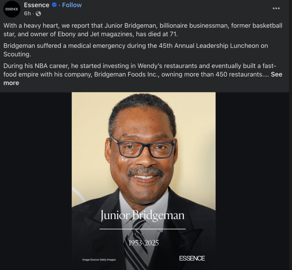 “While his play on the court was exceptional, it was as a leader in the business community that Junior truly excelled. He was a longtime franchisee for Wendy’s and Chili’s restaurants, at one time operating more than 450 locations in 20 states. He became a bottler for The Coca-Cola Co. and bought Ebony and Jet magazines.”