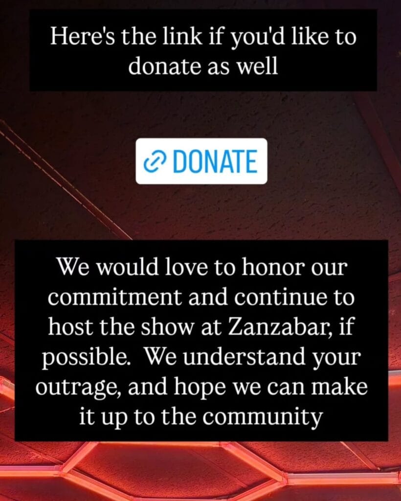“That being said, we appreciate Zanzabar’s apology and their efforts to make things right, but we will not be working with this venue.”
