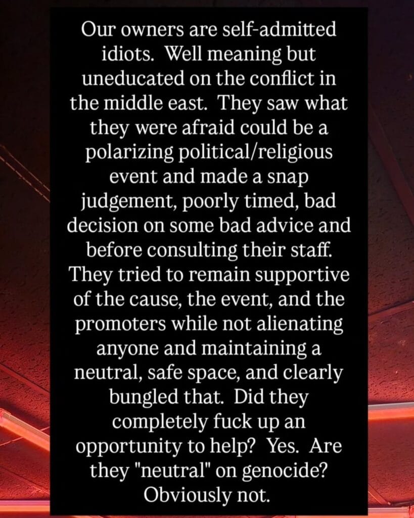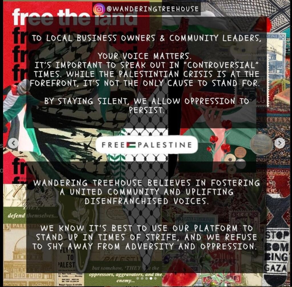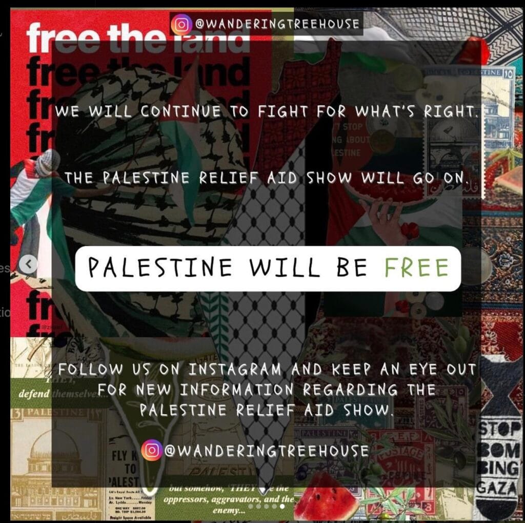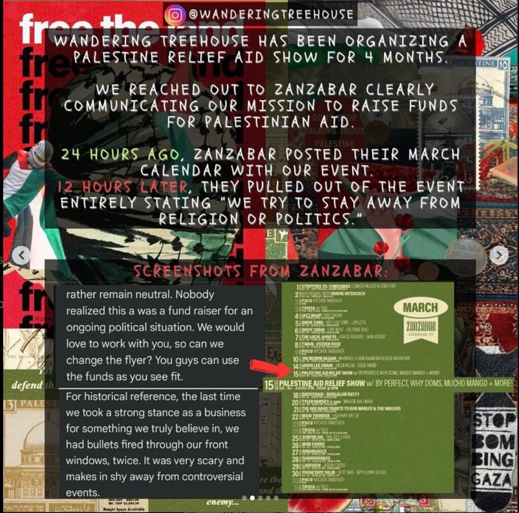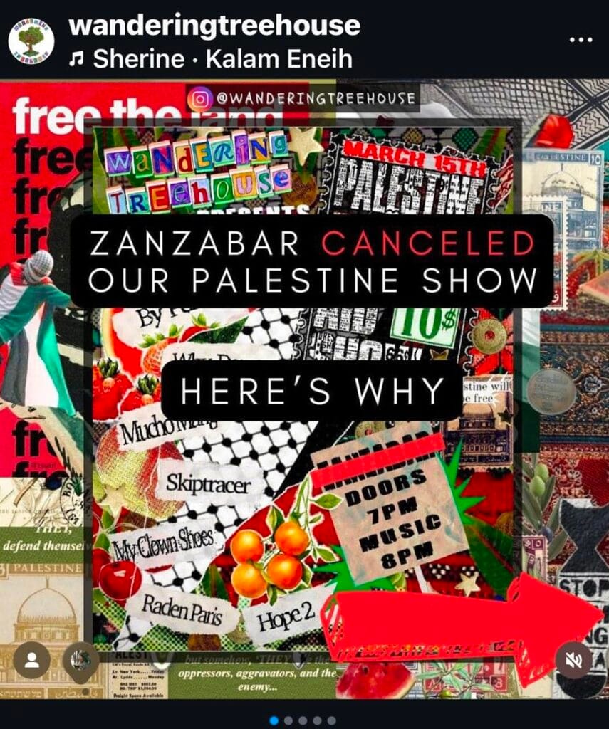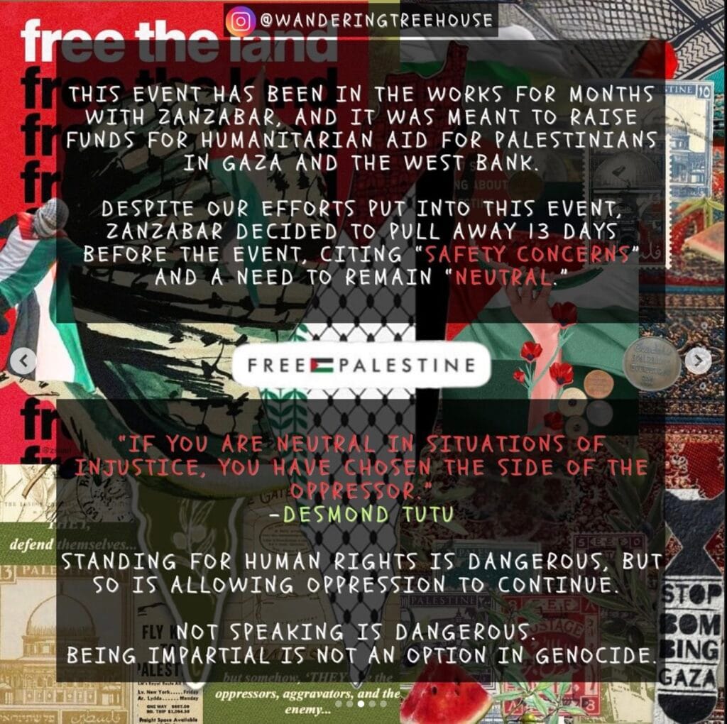 In a multi-screen post, the group describes their account of why Zanzabar canceled their event. In their Instagram post, the group said, “Wandering Treehouse believes neutrality is not an option. Zanzabar canceled our Palestine Aid Relief Show, but we will not be silent. Palestinians have faced 75+ years of occupation, displacement, and apartheid. Standing for human rights is dangerous yes-but, allowing oppression to continue is more. Speak up, take action, and stand in solidarity. Free Palestine🇵🇸🇵🇸”