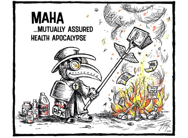 This week’s cartoon hits at Trump Secretary for Health and Human Services Robert F. Kennedy, Jr., and his willful ignoring of science and health best practices.